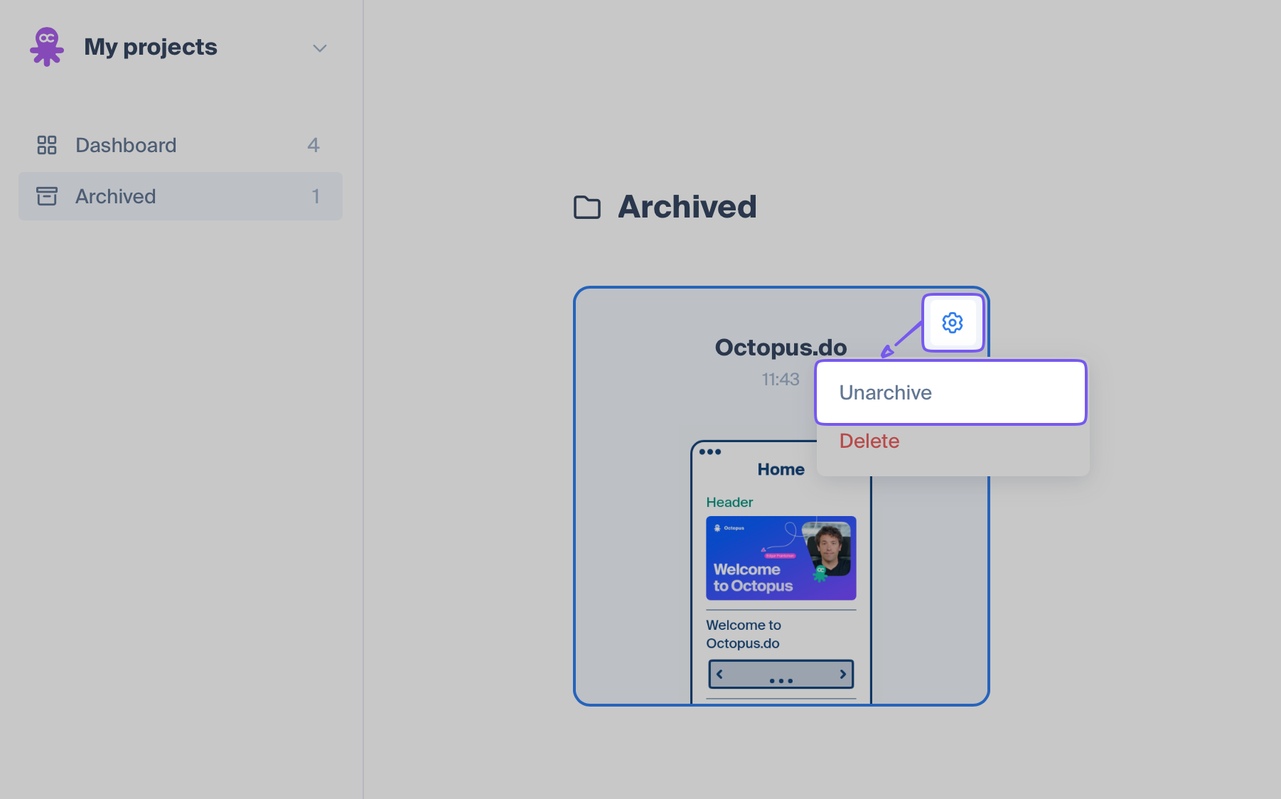 Unarchive a project To unarchive a project, please proceed to the Projects dashboard and scroll down to the archive section. Click on the "Archive" link to expand archived projects. Then click on the project menu and use the Unarchive option.
