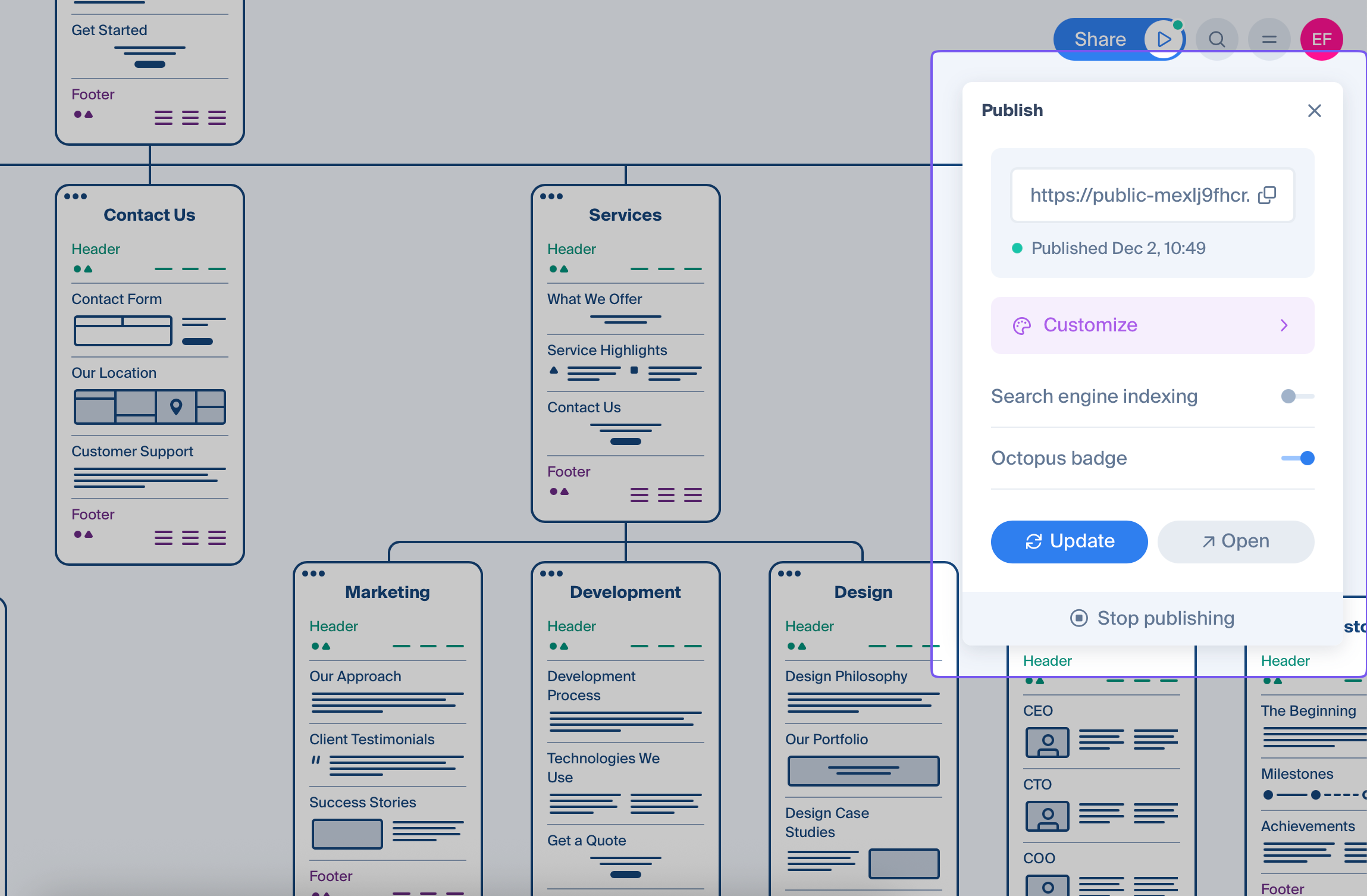 Octopus.do allows creating a simple website from your project - it only takes a few moments to have your project wrapped in a minimal design and launched live.